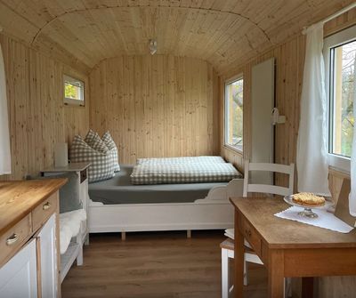Eine außergewöhnliche, originelle & naturnahe Auszeit im Bauwagen – Mit Allem, was Du für entspannte Tage draußen und für geruhsame Nächte im Inneren brauchst. Unser “FREI-LAND- Häusle“ ist ausgestattet mit einem gemütlichen Doppelbett & einer bequemen Sitzmöglichkeit.
